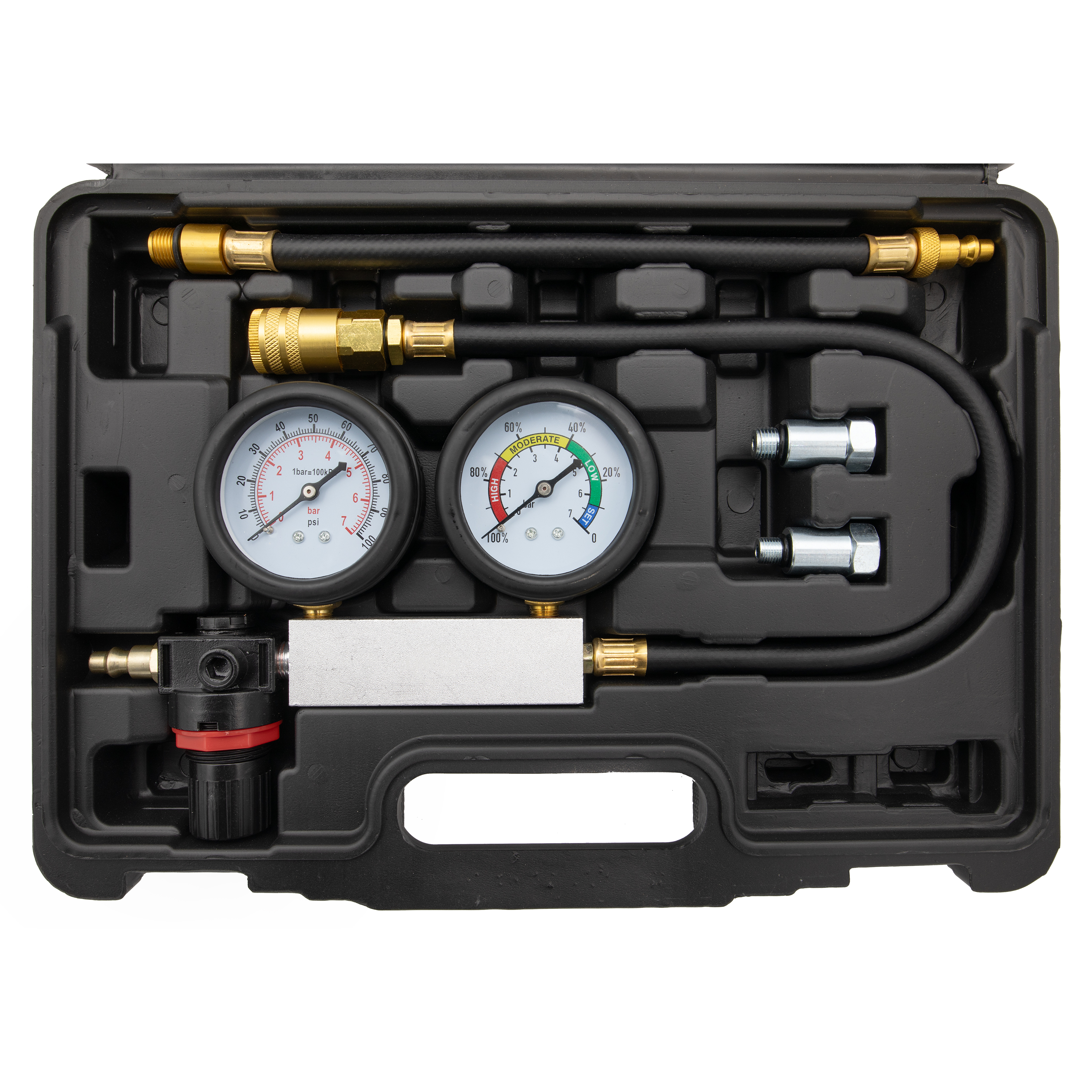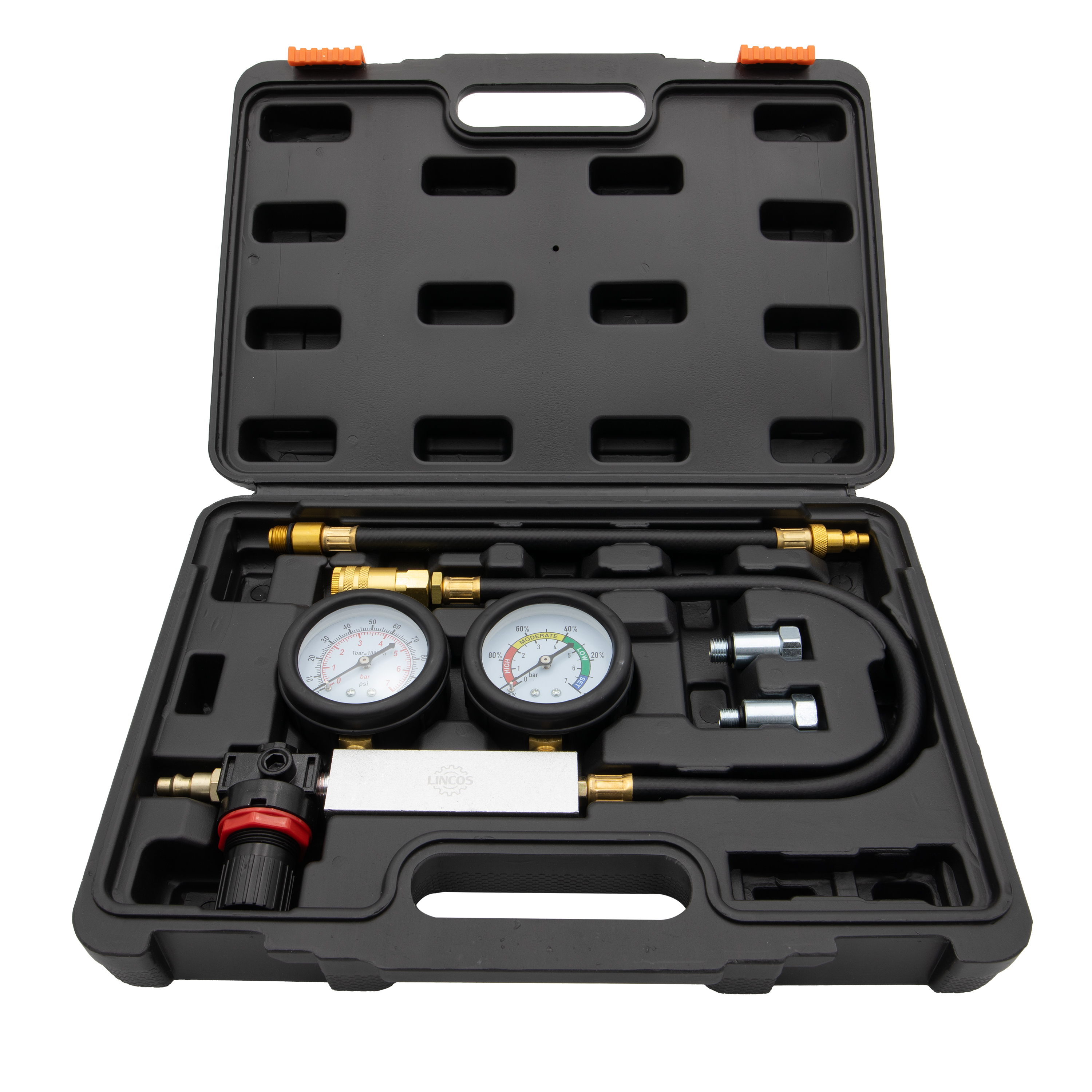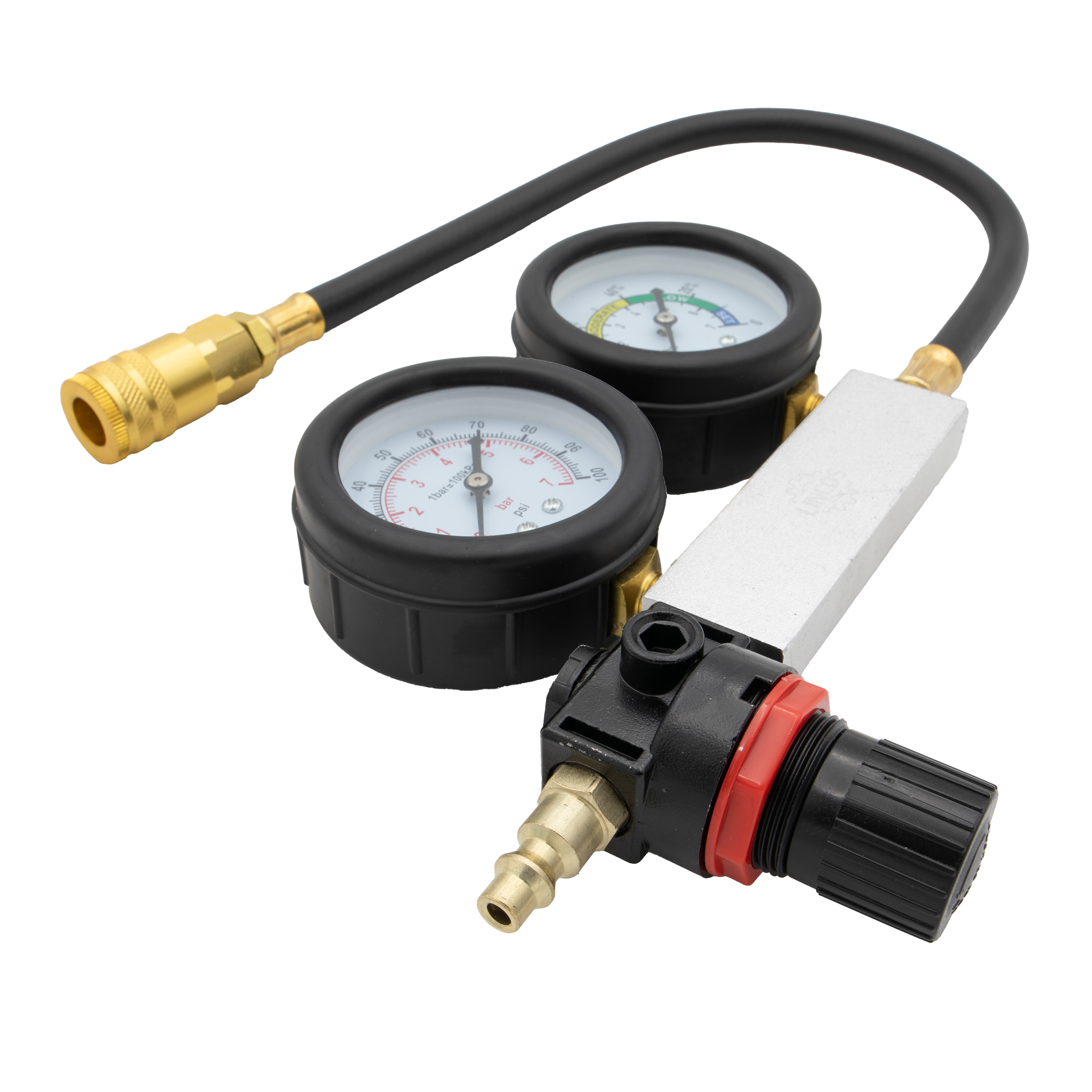- Tester těsnosti válců se 2 manometry je univerzálně použitelný nástroj, který je vhodný pro testování všech benzínových motorů, které mají zapalovací svíčky 10 mm, 12 mm nebo 14 mm.