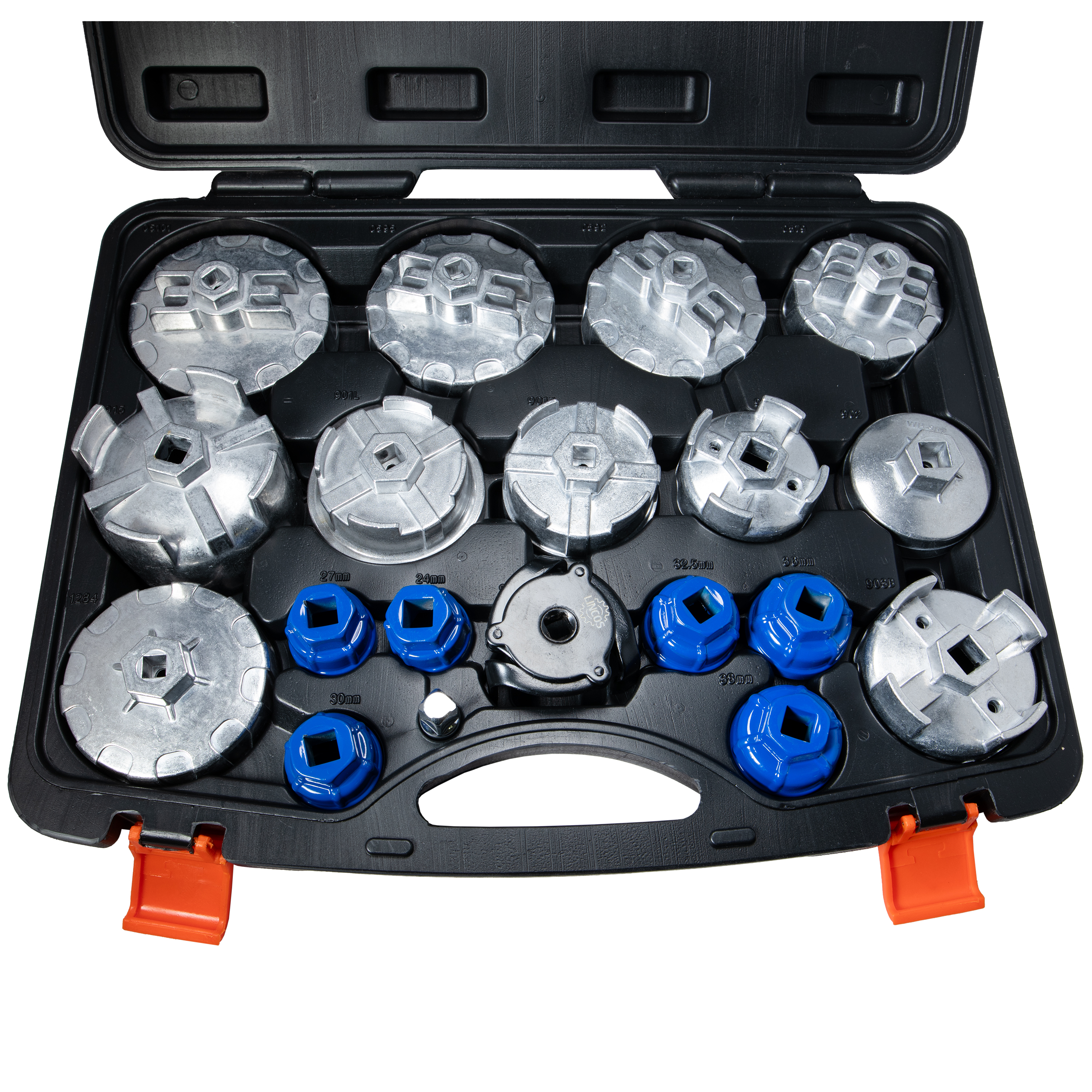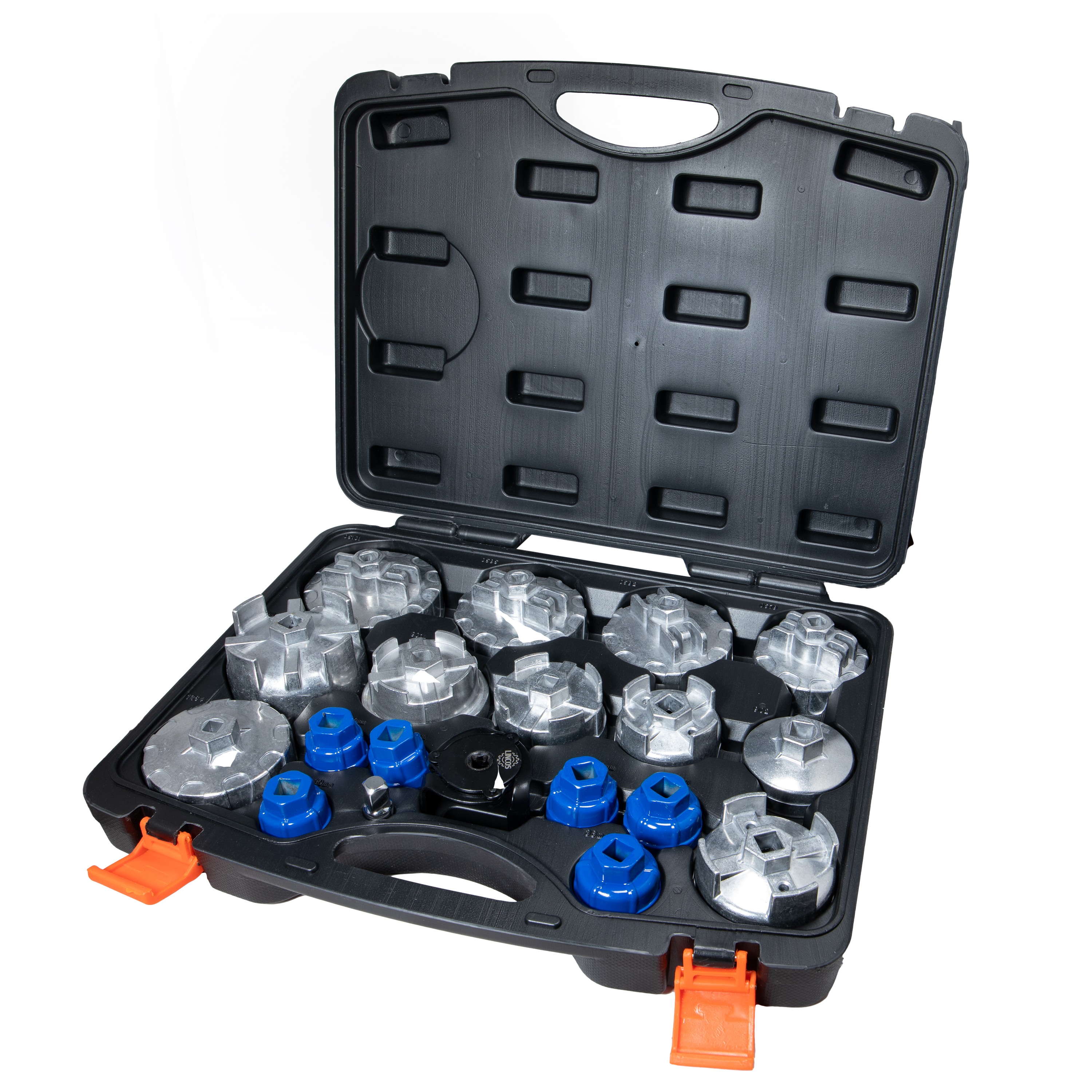 Sada 21 nátrubků pro vyšroubování olejových filtrů. Pasuje na většinu osobních vozů vyráběných na evropském, americkém a asijském trhu.