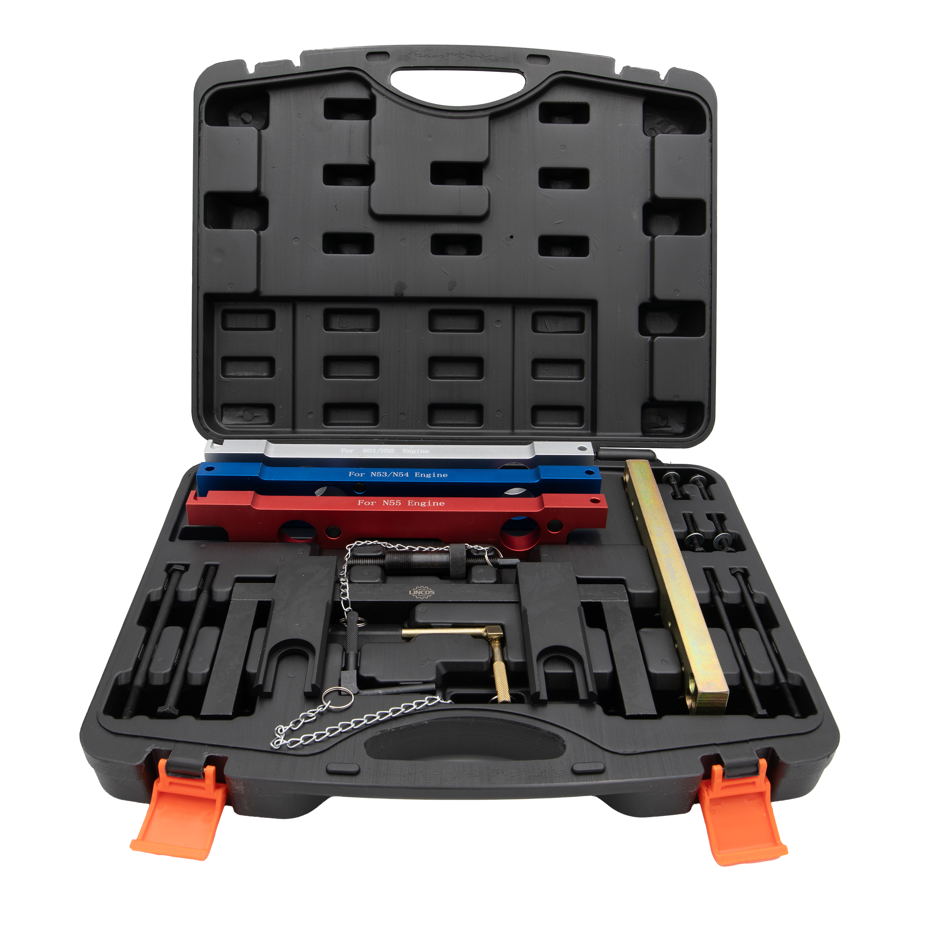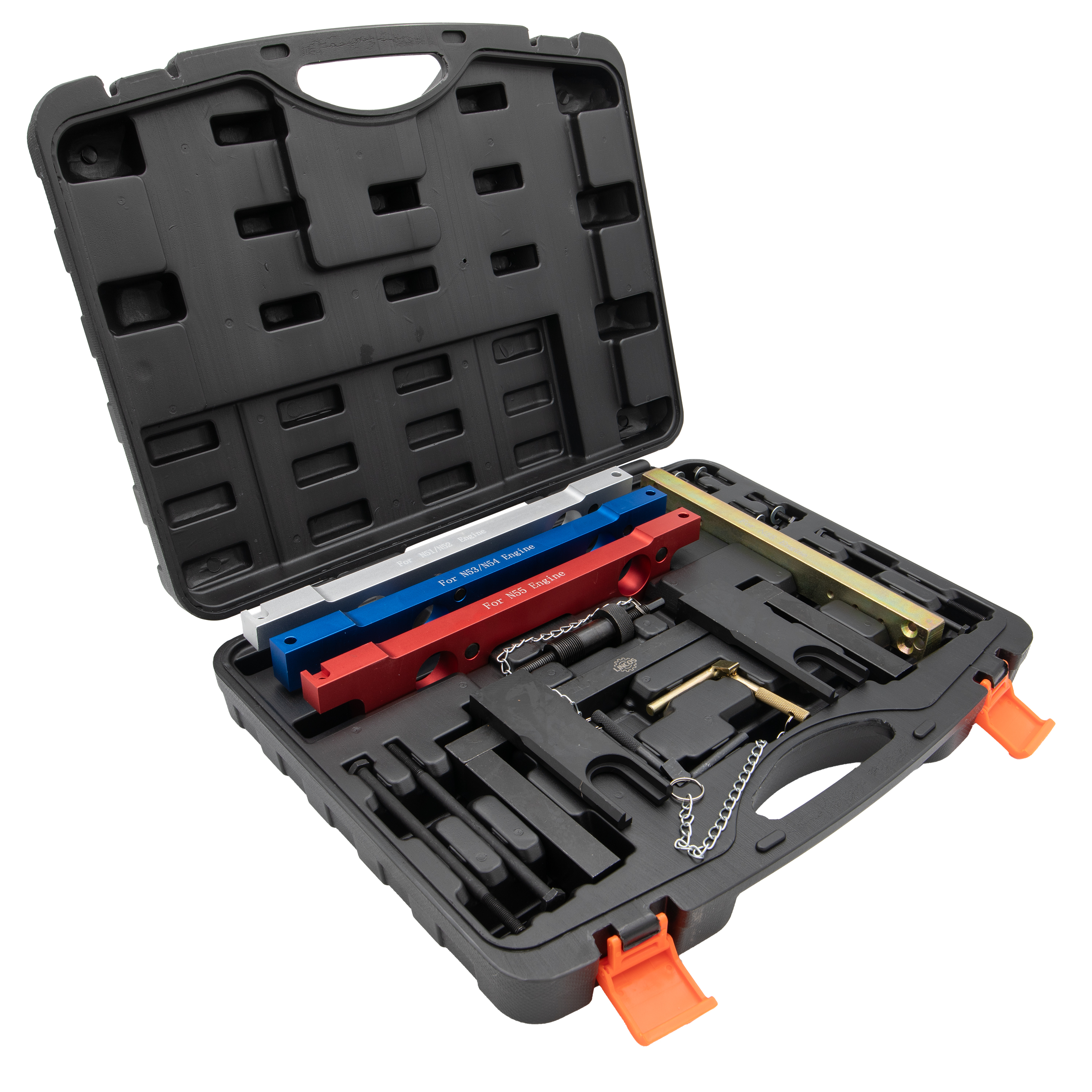 Tato sada nástrojů pro blokování rozvodu motoru je speciálně navržena pro novější 4válcové turbo motory BMW N20 a N26. Sada obsahuje specializované nástroje pro upevnění vačkového hřídele a enkodérového kola VANOS v horní úvrati, klíčové pro přesné časování a údržbu motoru.