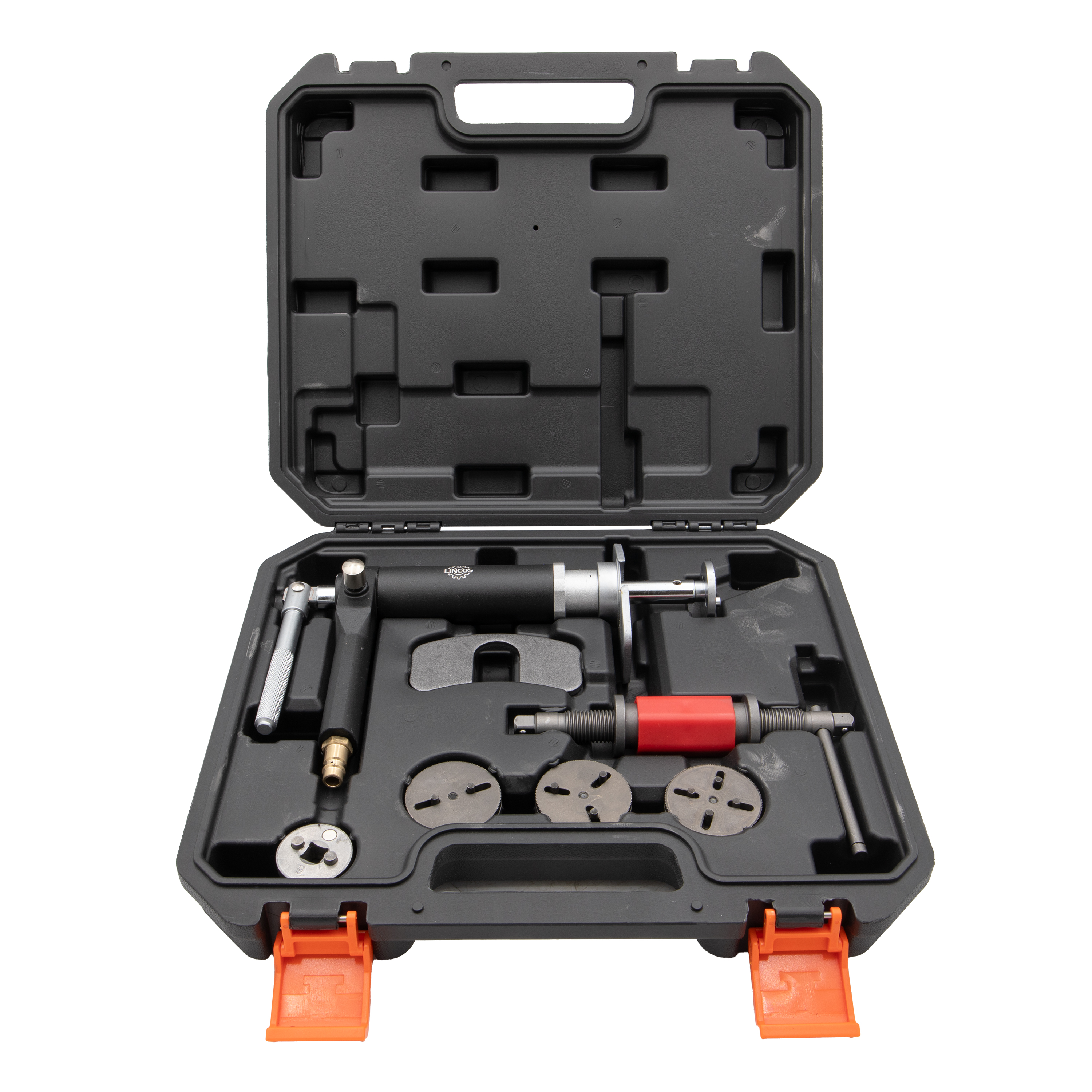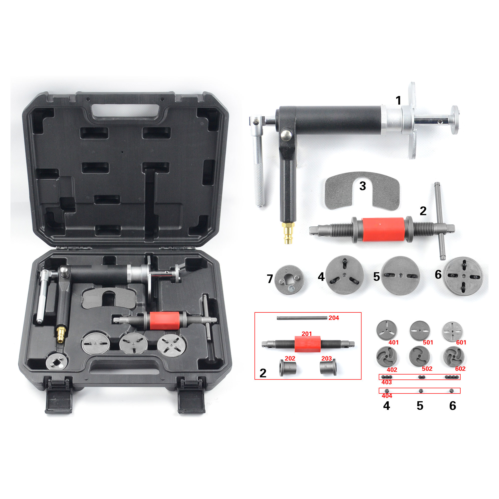 35dílná sada pro ruční vracení brzdových pístků u většiny vozidel. Obsahuje pravotočivé a levotočivé nástroje a adaptéry.