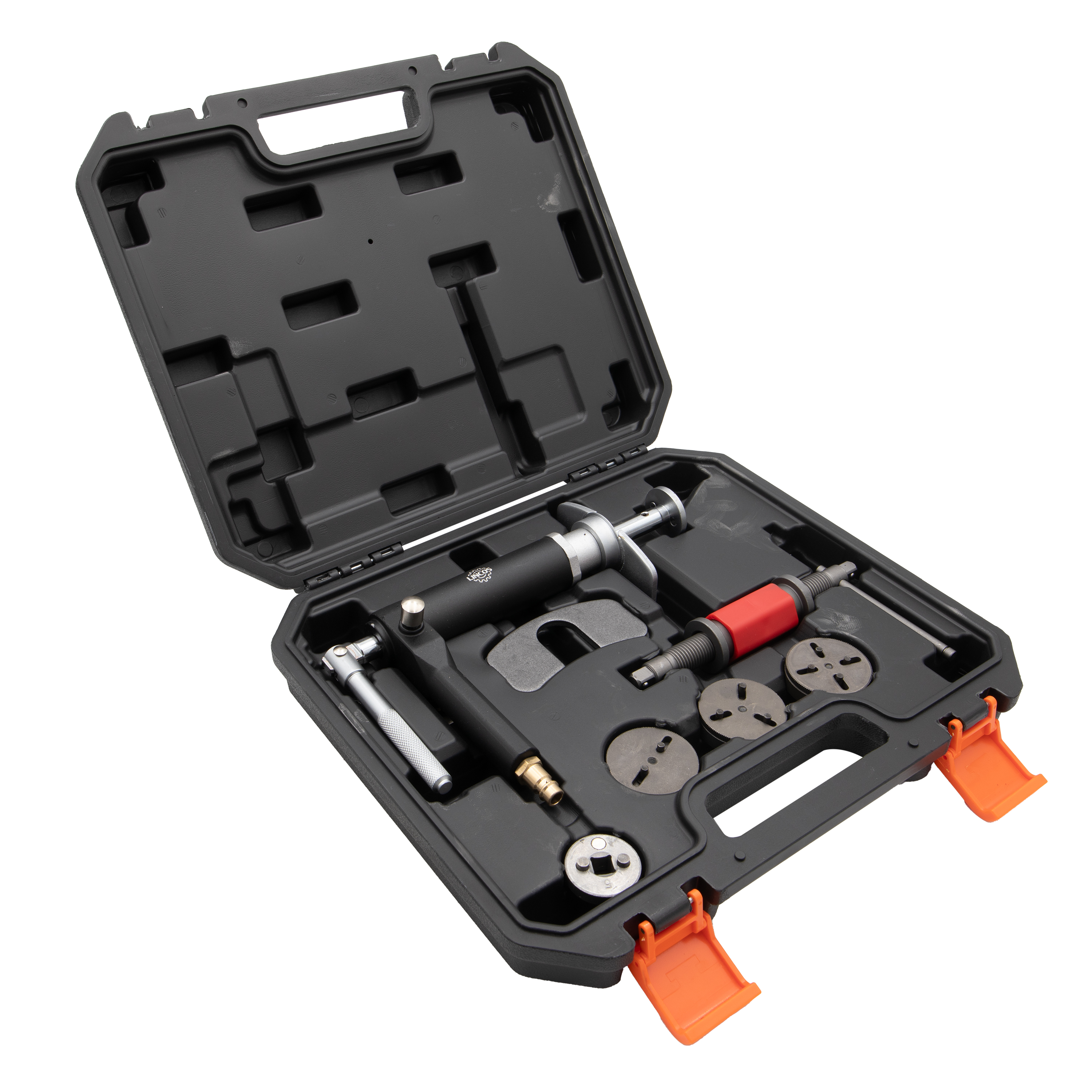 Tato 8dílná sada obsahuje jedinečné nastavitelné 2kolíkové, 3kolíkové a 4kolíkové adaptéry spolu s 3/8" adaptérem s magnetem. Navrženo pro použití ve směru hodinových ručiček i pro leváky, umožňuje centrovaný reset brzdový píst, který zabraňuje naklánění a zabraňuje poškození botek, pístů a vrtání pístů v brzdovém třmenu.
