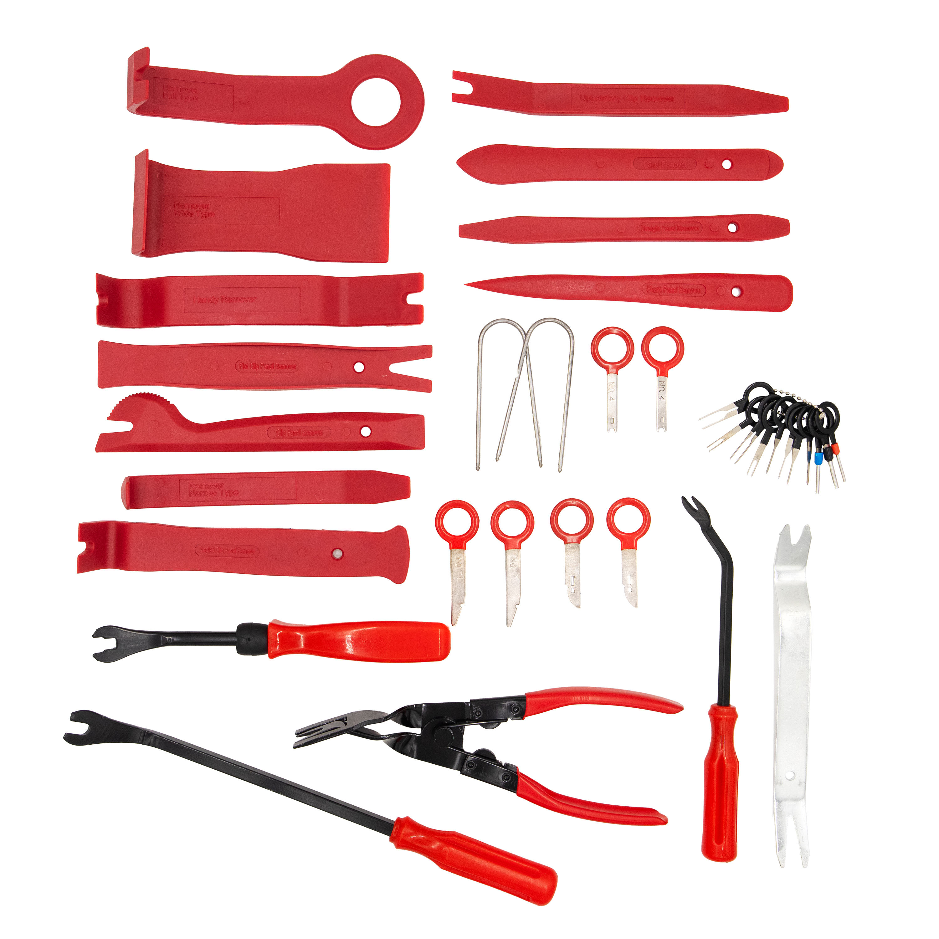 22dílná sada nástrojů pro demontáž obložení určená pro efektivní opravy interiéru, demontáž palubní desky a demontáž plastových klipů. Lehký, ergonomický a je dodáván s přenosným úložným pouzdrem.