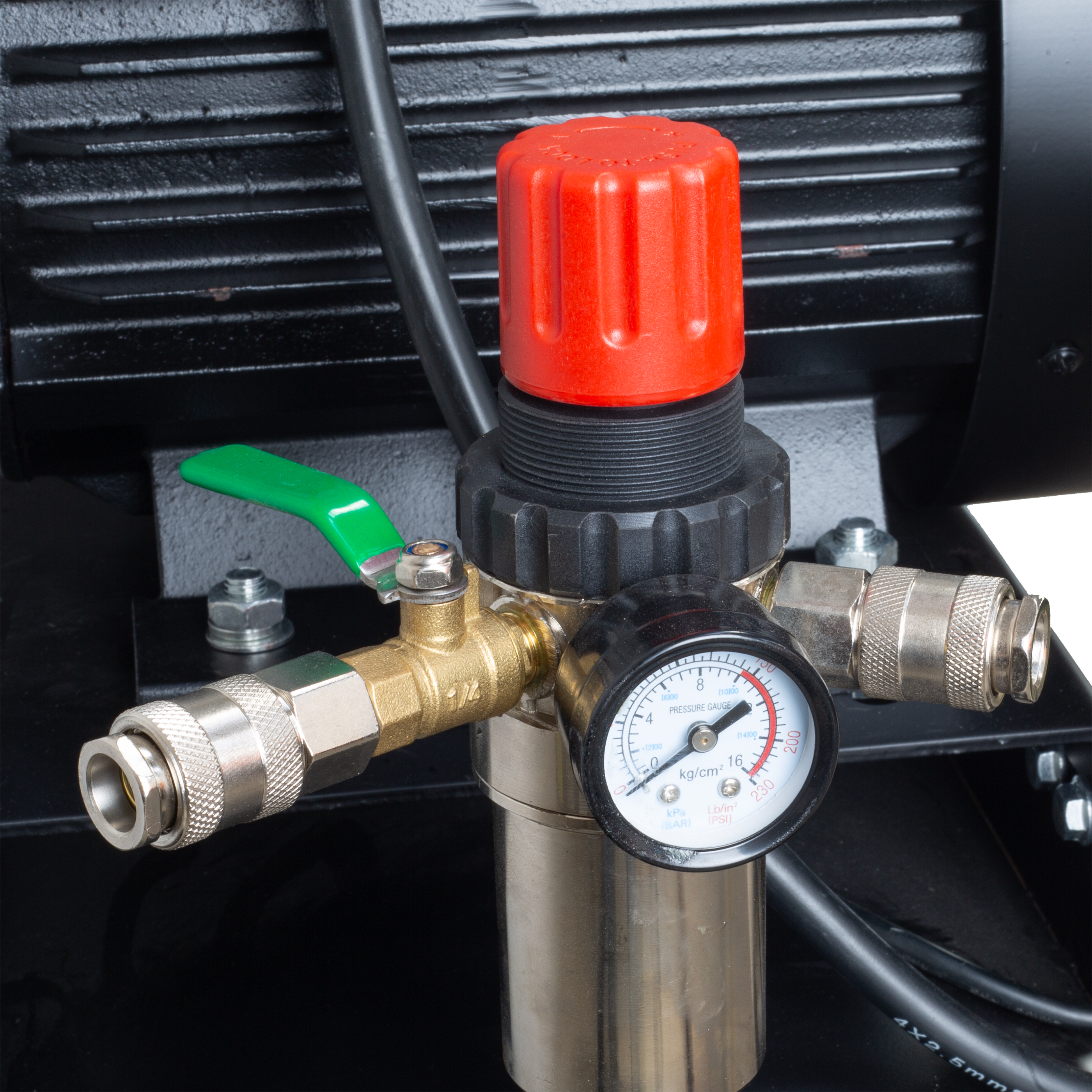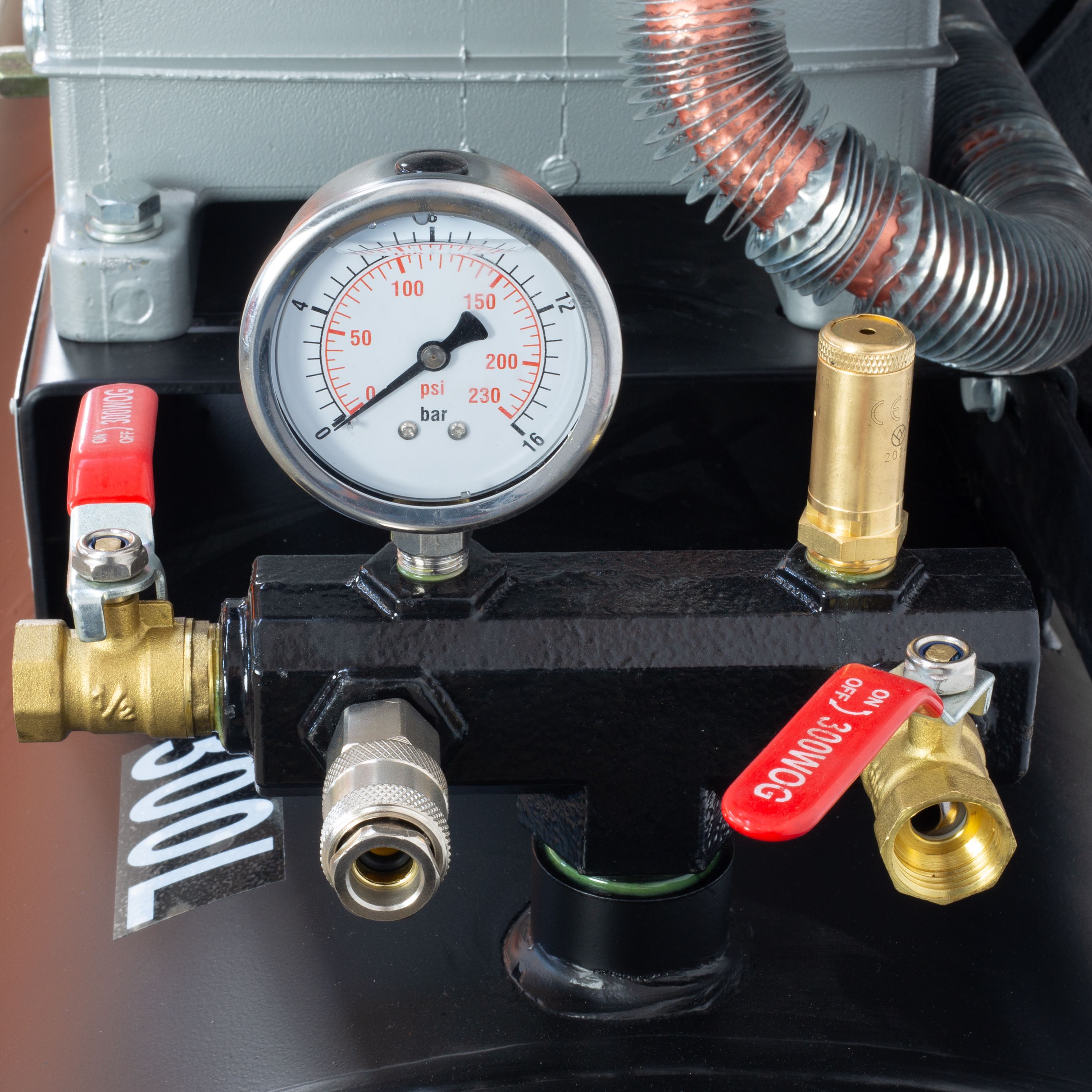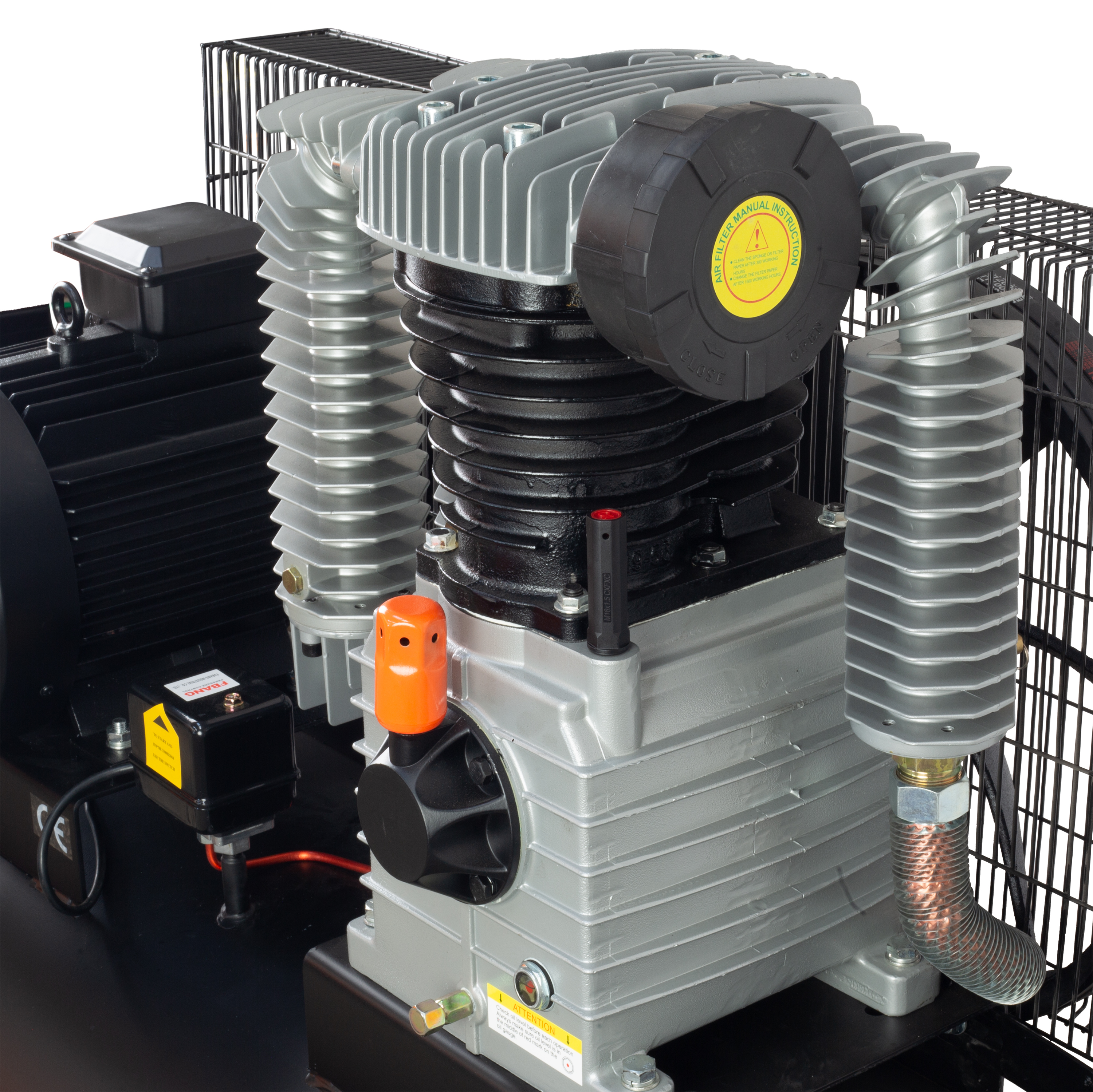 Řemenem poháněný olejový kompresor s H-blokem, měděné vinutí motoru, výkon 900l/min, tlaková nádoba 300l, 5.5kW (400V), 12.5bar, 4 pevná kola, 2válcový