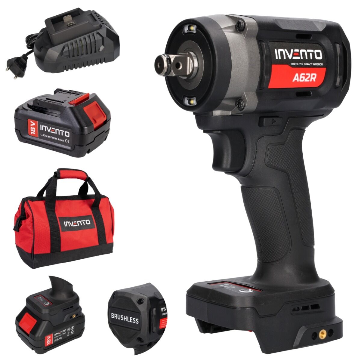 INVENTO A62R pracuje se jmenovitým napětím 18 V a je kompatibilní s bateriemi řady INVENTO, což umožňuje snadné sdílení baterie s dalším nářadím.