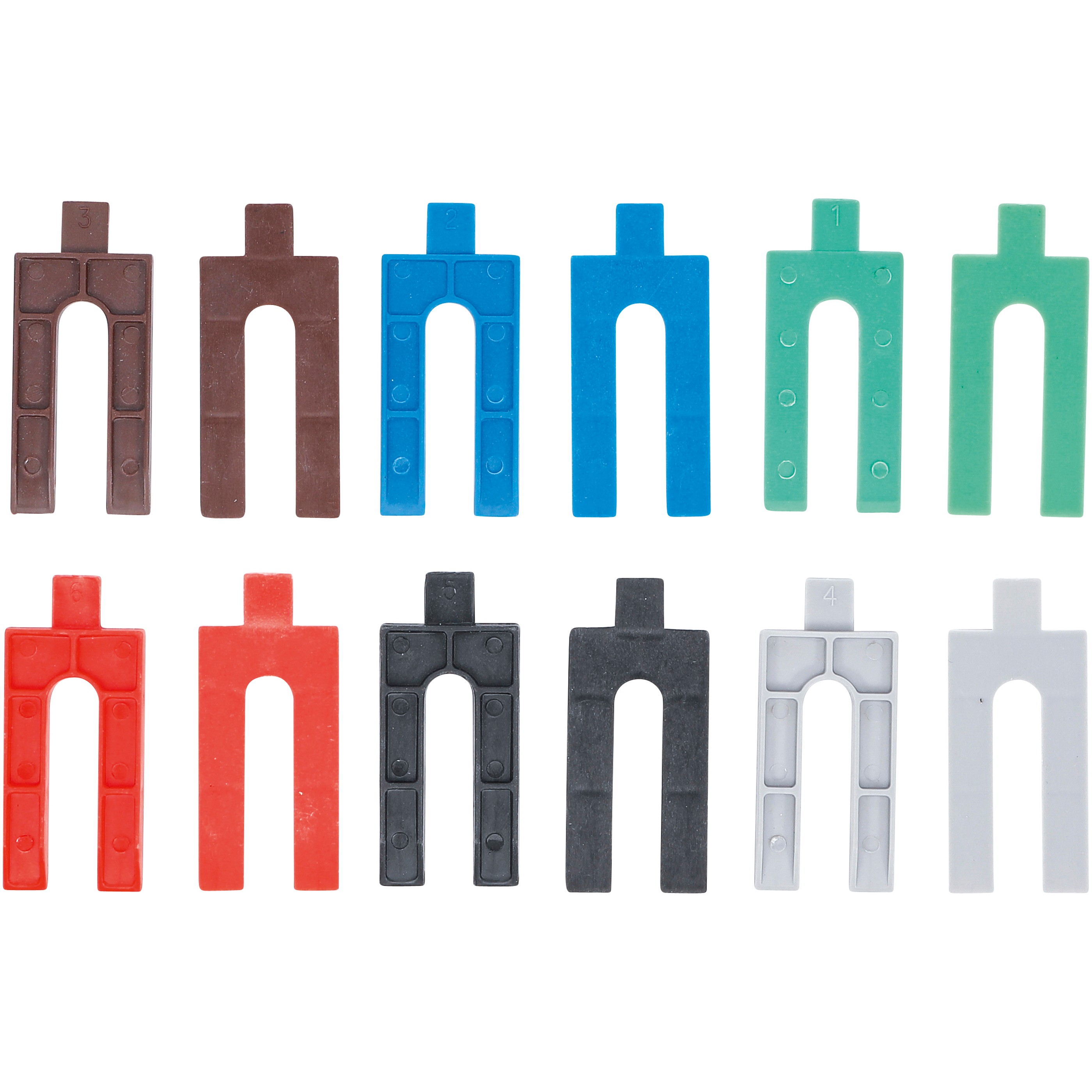 Každý klínek je barevně odlišen podle své tloušťky, což umožní rychlou identifikaci požadované velikosti. Sada obsahuje šest různých výšek od 1 mm do 6 mm, což zajišťuje univerzální využití pro širokou škálu aplikací.